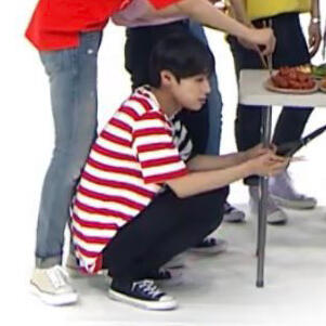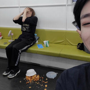 he’s clumsy ! not awfully like jangjun, who always falls of chairs, but he tends to drop and lose stuff. here’s a photo of him in despair after dropping Literally all his food.